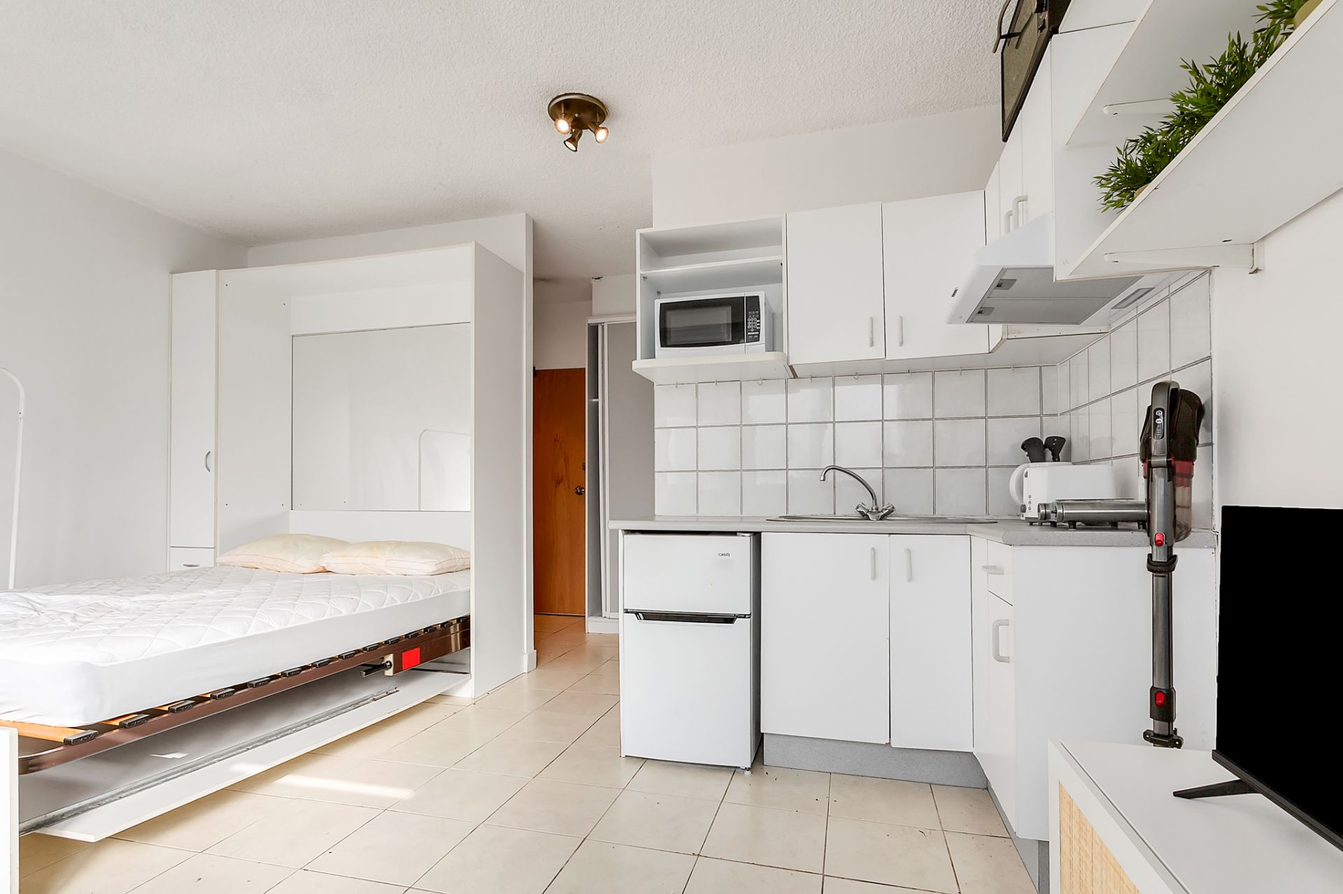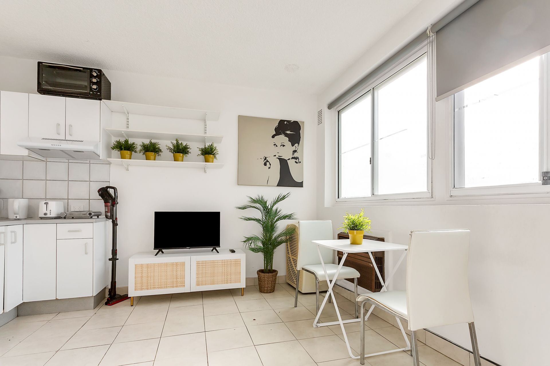 The bonus is the large windows and loads of natural light. Neat and tidy kitchen and bathroom with bath
