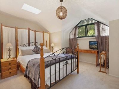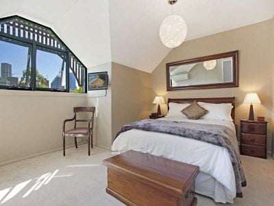 The bedrooms, located upstairs. Each enjoying high cathedral ceilings, complimented by a warm neutral décor & superb contemporary design with an emphasis on natural timber finishes, means that this home is a sanctuary in a busy city environment. The home has its own front door & a designated street number however still enjoys the perks of being part of a security building, & is fitted with as new quality furnishings including: