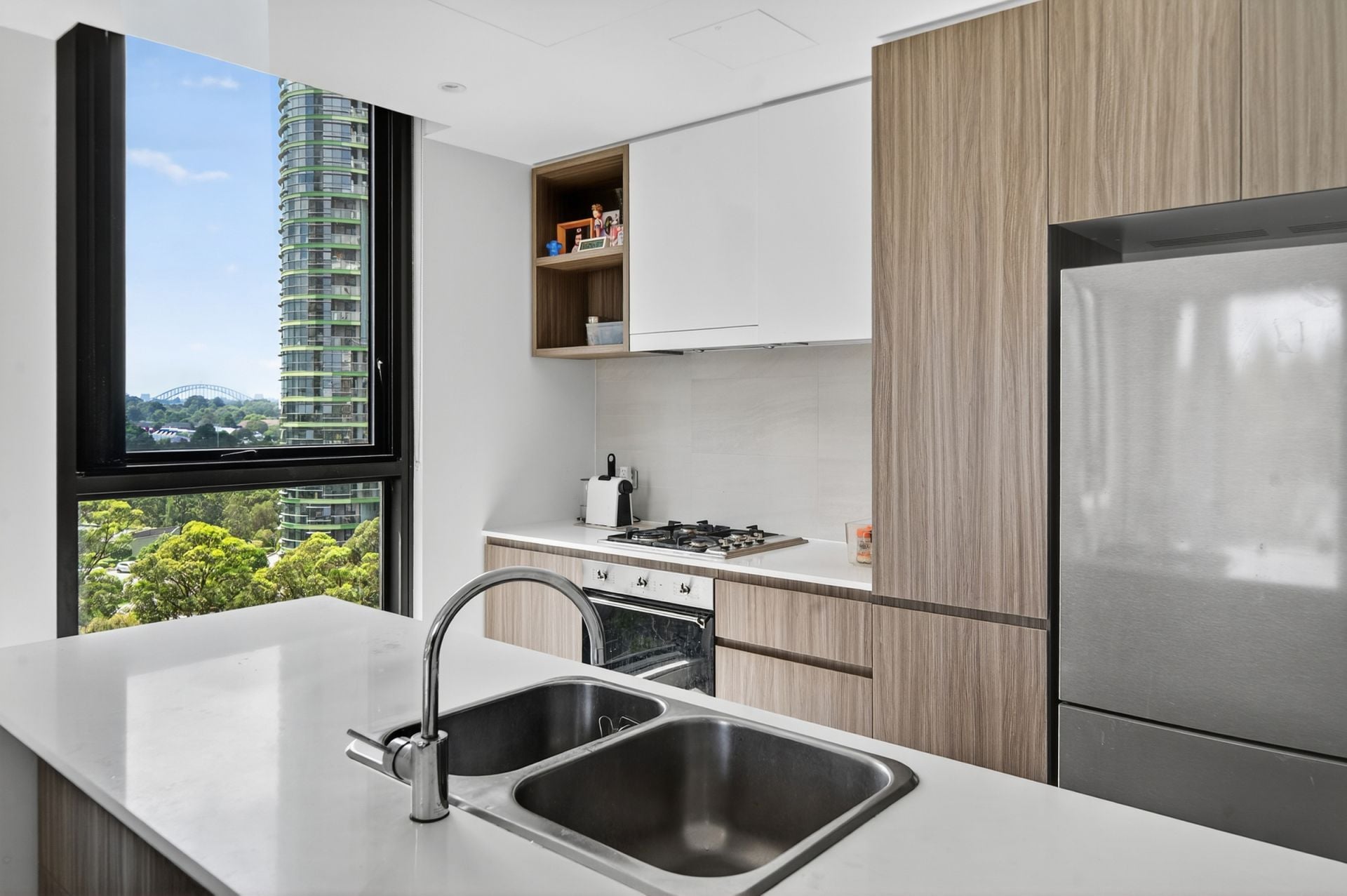 Gourmet Kitchen – Upgraded with premium Smeg appliances, Caesarstone benchtops, a large pantry, and an outlook to Bicentennial Park and the Harbour Bridge.