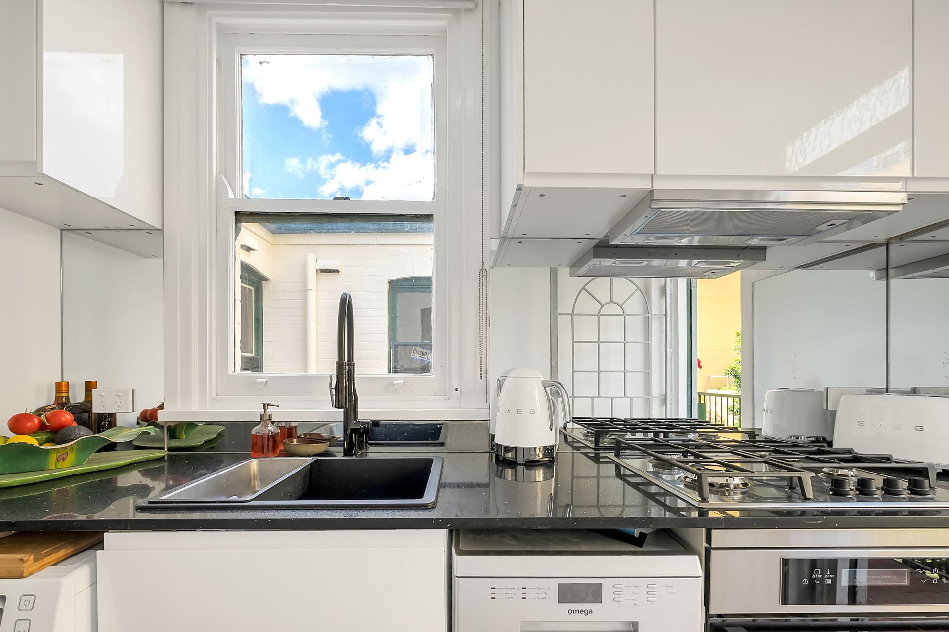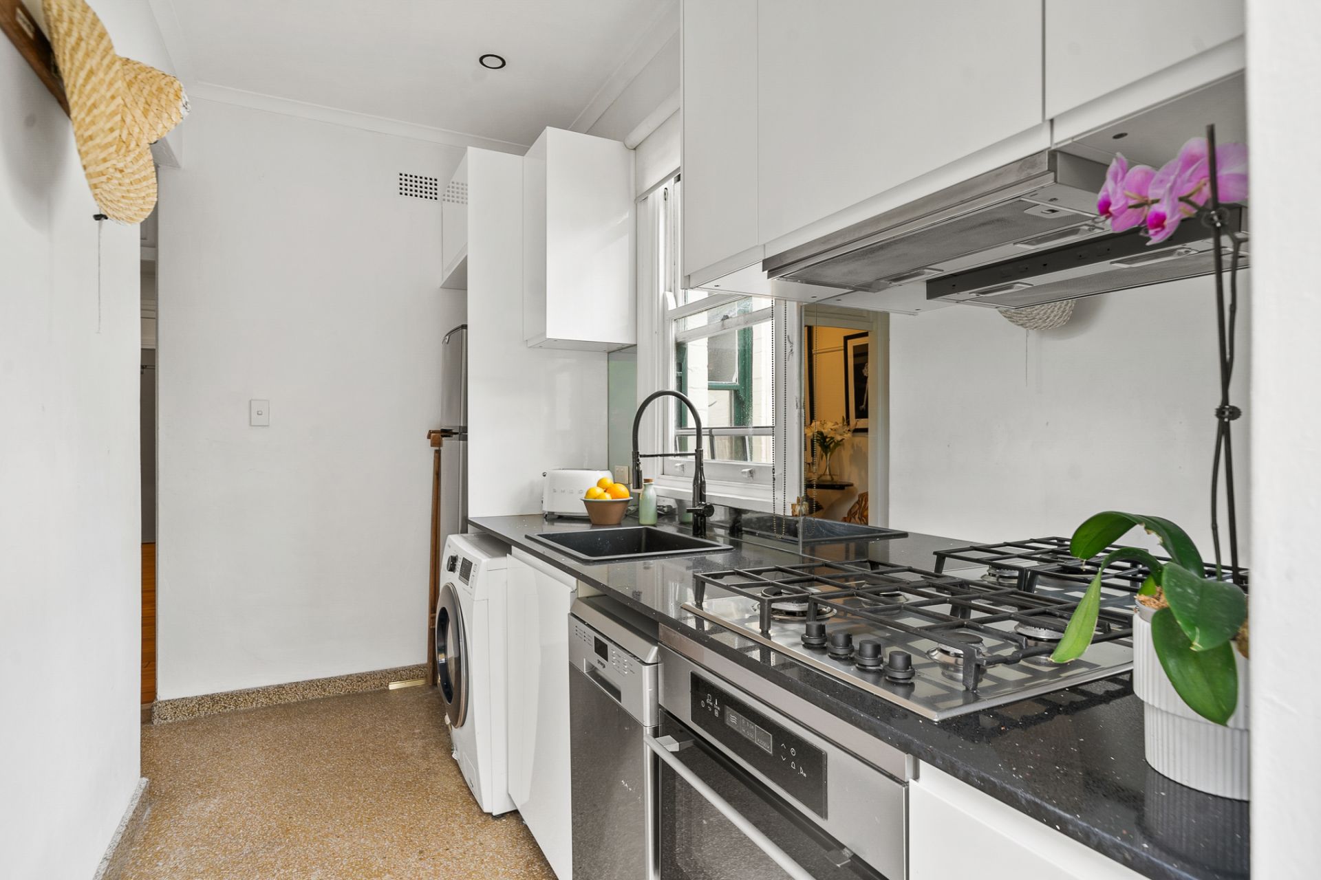 The newly renovated kitchen features granite benchtops and quality appliances, with direct access to a leafy communal balcony and mini garden. It's the perfect spot for morning coffee, afternoon sun, or catching up with neighbours as the city glitters below.